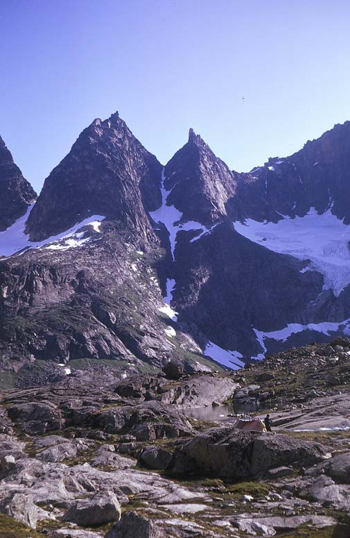 Lost Loch Camp, pitched at the rim of a lochan in a reclusive cirque. Above (left) is Matterhorn 'C' and to its right is Spirifer. The party enjoyed fine weather and an idyllic fortnight here, hence its alternative name: Shangri-La. We had a short day to get in step with the demands of an early start for a climbing day. We admired the ephemeral mist banners hanging round the peaks, explored and botanised and hopped on and off ice floes. We carried up further boxes of luxury foods to add to our stock of provisions. The mellow sunset on the southern mountains and the clear sparkle of the alpenglow creeping up the nearby walls and pinnacles promised well for our first climbing day. We were awakened by the first blink of the sunshine creeping through a gap between the pinnacles of the Anvil : it was a good 6.30 am alarm clock. Morning mist covered the camp but we could glimpse blue skies through the clammy clouds. We prepared cautiously, waiting for the promise of the day to materialise. It was 9 am when we started on the soon-to-be familiar route to the northern hills : over the boulders, along the snow banks hanging truncated over the loch waters, turning uphill on steep scree and into a horticultural maze, clinging to the mountainside of dense herbfields speckled with the intense blue of veronicas and gentians, the yellow claws of stonecrop, the spreading fans of Alpine Lady's Mantle, gaining the moraines of a hanging corrie lip, aiming for an imaginary broken route cut into the central wall of our mountain objective. We gathered in a green bowl in an amphitheatre of cliffs, while far below was the green lake with its rotting floes crowding towards the river outlet. We listened to the crash of falling blocks spilling off a contorted glacier cliff across the valley. Climbers donned their gaudy orange harnesses : it was strip-to-the-waist weather. We began to climb at 11.30 am. There were to be 17 pitches, each providing its own specific interest, before we were to quit our climb at 7.00 pm. We moved in two parties. The Gaskell-Matheson team tackling the more abrupt and problematical direct route, the three-man team skirting the harder sections to find a route more in keeping with their abilities and wishes. The summit tower gave three excellent pitches with the final short steep wall leading to a thrusting and airy mantle-shelf, where with all stops out and draining the last ounce of energy, we pulled up with clutching hands locked frantically on faint rugosities and toes crunching on layers of dry rock tripe. We were all just able to sit precariously on the tiny summit of Spirifer. There was no wind, a snow bunting sang on the ridge, the distant hills were clear and sharp, the waters of lake Tasserssuaq and the old tracks were in the shadows of the northern valley.