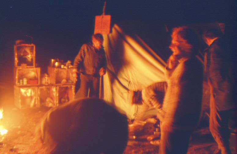 Our basecamp felt no better - no worse than expected. There was ground coffee, cigarettes and news. The hard men had cruised under the vast slab faces that fell without flaw into the fjord, and turning up a side valley found themselves in a veritable stockade of ferocious spires. They were into the Land of the Towers. Although Sharples and Cant had padded a delicate ascent through the leering malevolence of the Ogre, it in return, clasped their abseil ropes with a vice and practically refused to release them. They were racked on their attempt on the Tower of Pain, but, with Gaskell and Aldred they shoved the ancient Andy's Rucksack (Agdlerussakasit) into the proverbial bag. On a more relaxed note the two long-distance feich trippers Hunt and Clark had enjoyed a fine trip, exploring Viking farm sites and ruins along the inlets and travelling as far as the coast opposite to the southern settlement of Fredriksdal, where they were joined briefly by the Queen of Denmark and her helicopter entourage. The base scene had been and still was full of action: Cant had gone with Aldred to make the second ascent of the Ben Trilleachan slabby second tower up the valley and returned soon after we had walked into the camp. The homely shambles of the kitchen was a change from the excessive organisation of the canoe trips. A grand triple rainbow arced over the bay at cooking time. We sang into the early night. One more day to go… It needed a fine day to enable all the packing to be done under dry conditions. The morning mist condensed down as light drops of moisture. I had always been lucky and avoided a last damp disaster day. This was to be no exception. The mist wafted away to drape the southern hills with white gauze filaments of cloud against an azure backcloth of sky. It was to be the best sparkling day for a week. We sorted, packed, tidied, carried down to the tea chests on the shore, filled in the spaces and hammered down the lids. A strange man appeared to take us away: he was a day too early. Please, come back tomorrow. We ate early in the big tent. We were subdued in spirit. MacKenzie broke the spell: he lit the refuse pile fire too early, much to some people's complaining disgust. Yet everyone came to stand and then sit around the flames. The accordionists started to pump and pull their instruments, the songs took off. Two beer cans and a tot of Queen Anne whisky each was the ration to sustain the mood. The fire grew into an inferno, most suitable for circus-style fire hurdling as long as it wasn't done head first as one surprised member found to his horror when the springboard crate collapsed under his weight. A ring of dancing figures pranced round the fire's perimeter, a conductor orchestrated the music from a burning tea chest podium balanced on the embers. This was the night of the farewells to our valley and its hills.