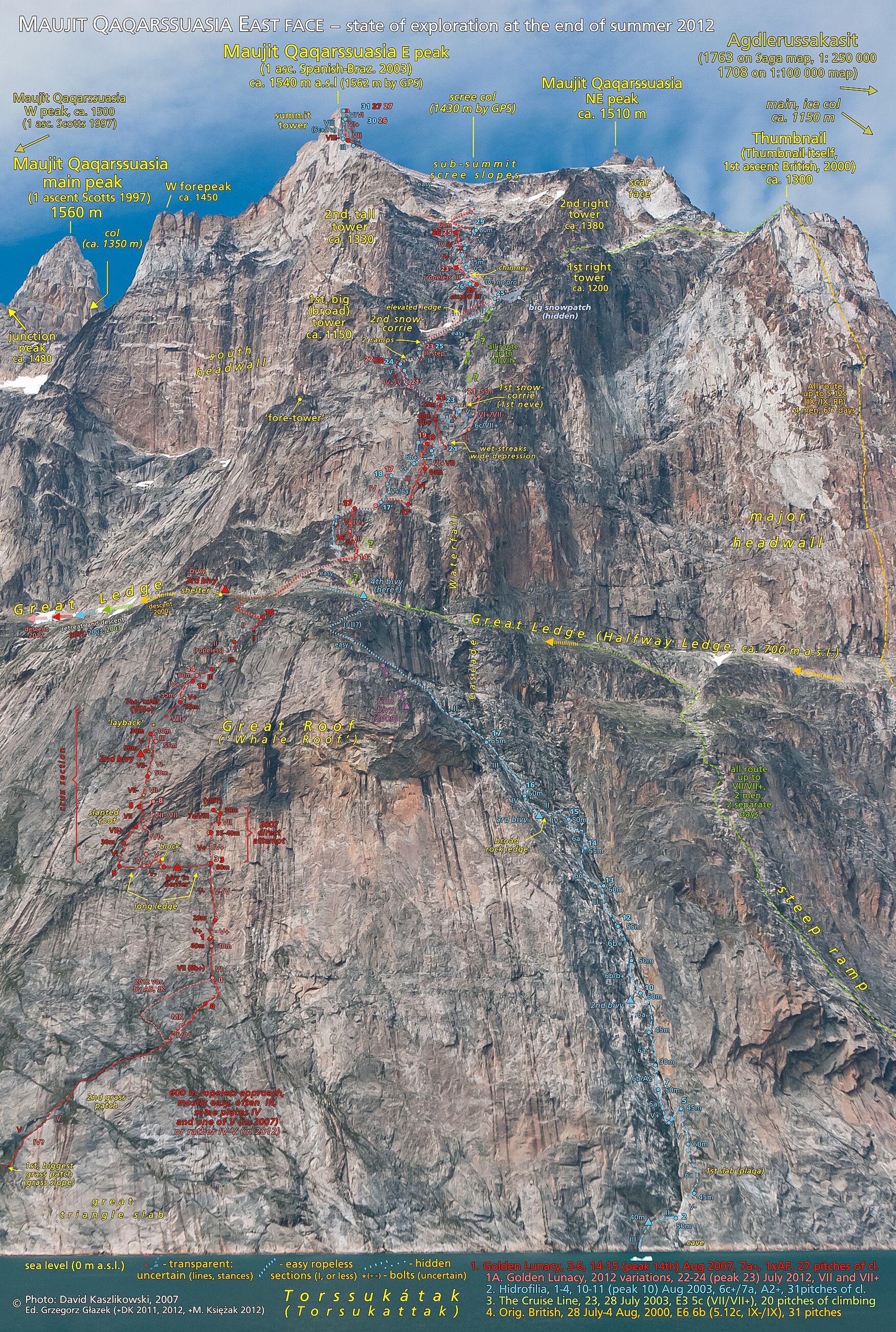 Thumbnail Cliffs Route Map Golden Lunacy route topo approved by Polish Mountaineering Asociation (PZA). Graphics, climbing history research by Grzegorz Glazek, with cooperation from Marcin Ksiezak (leader of 2012 expedition). Photo by David Kaszlikowski. The 2000 'British' route, the 2003 'Cruiseline' route, and the 2003 'Hidrofilia' route are also indicated.
